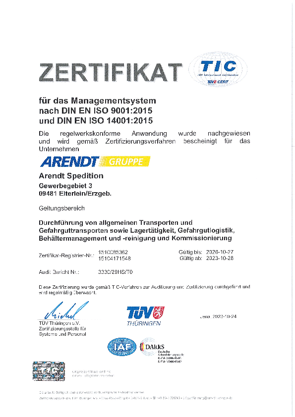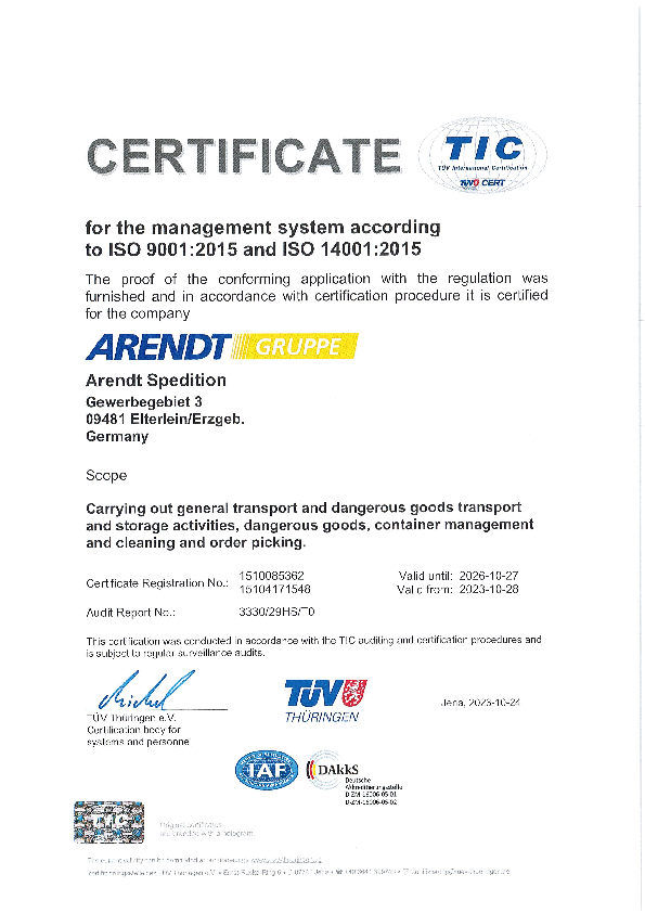 Bereits 1998 wurde die Arendt Spedition erstmals zertifiziert im Rahmen des Qualitätsmanagements.